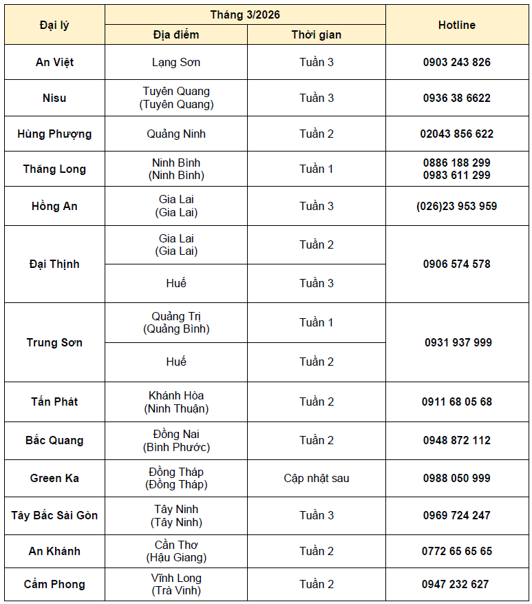 LỊCH BẢO DƯỠNG VÀ SỬA CHỮA LƯU ĐỘNG TẠI HỆ THỐNG ĐẠI LÝ ISUZU THÁNG 3/2026